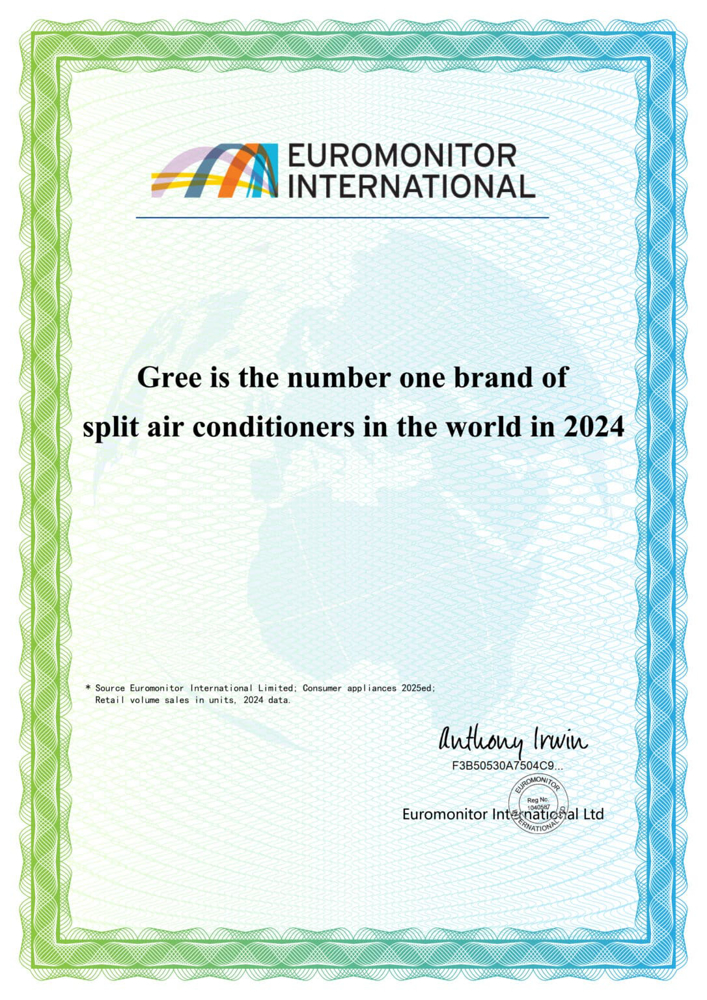 Volgens de Euromonitor International Consumer Appliances 2025 Edition is Gree het meest verkochte merk van split airconditioners, op basis van retailvolume in 2024. Met andere woorden, meer consumenten kiezen wereldwijd voor Gree dan voor enig ander merk. Dit bewijst niet alleen de superieure kwaliteit en energie-efficiëntie van onze producten, maar ook de enorme klanttevredenheid.